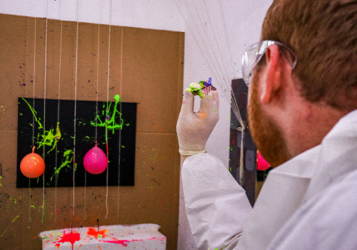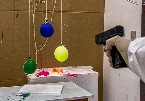 Prostřelením balónků zavěšených nad plátnem dochází k vytvoření různých barevných výbuchů.