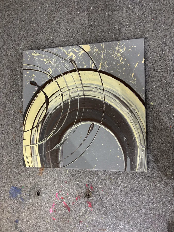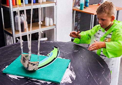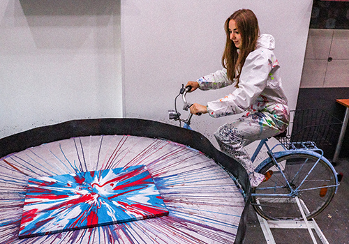 Šlapáním na kole se roztáčí stůl. Barvy na plátně tak odstředivou silou vytvoří jedinečné abstrakce.