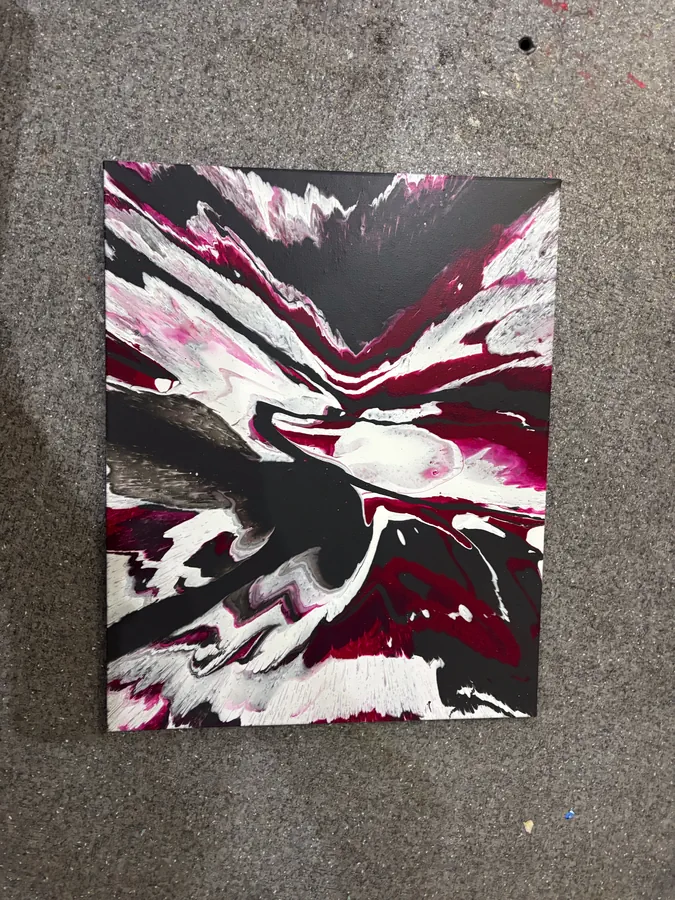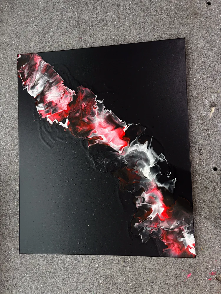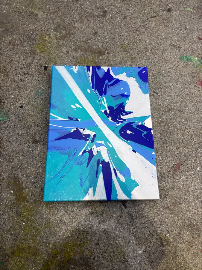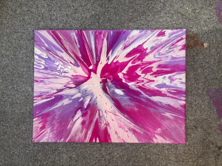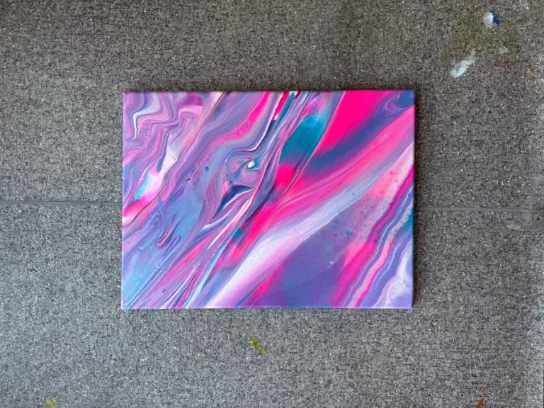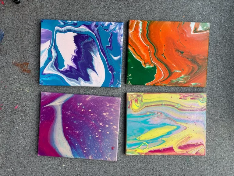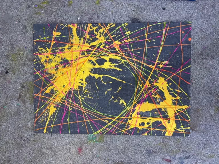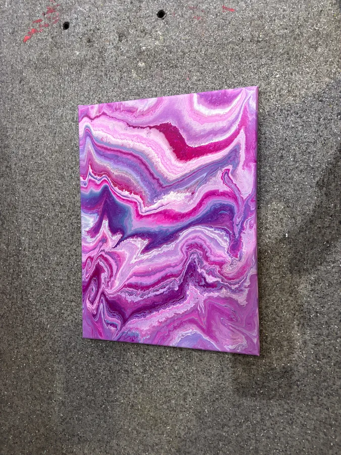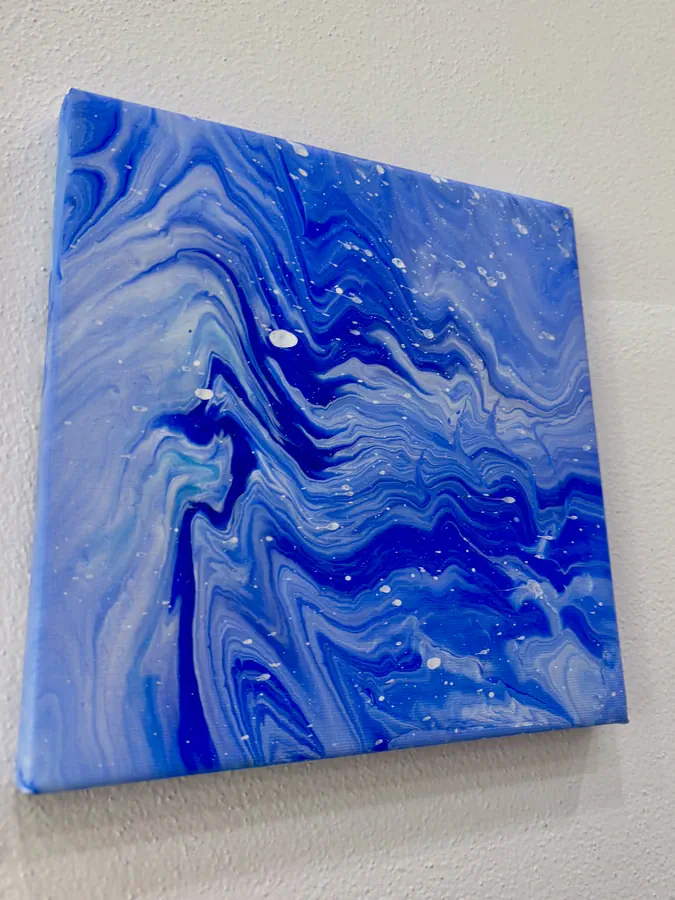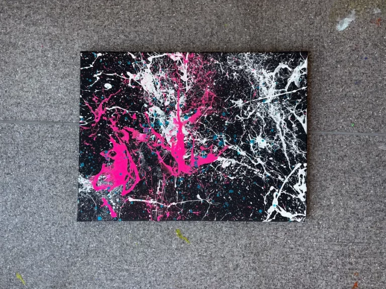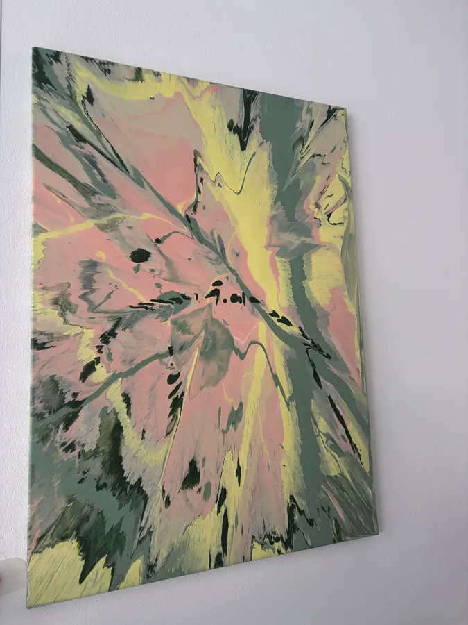 Barvy se nalijí do kelímku, který se vylije na plátno. Plátnem nakláníme a tím vzniká mramamový vzor.