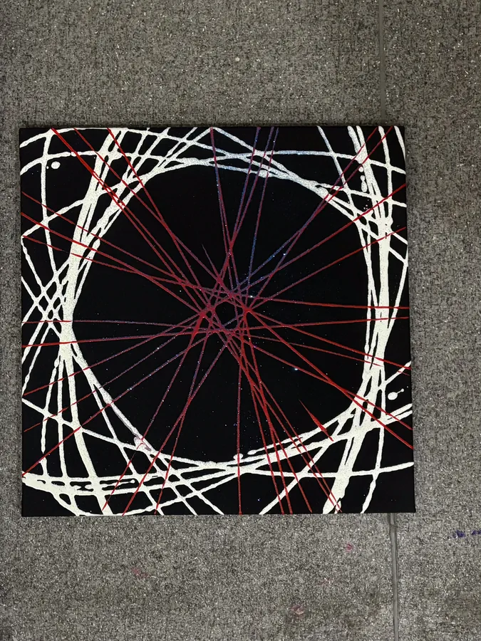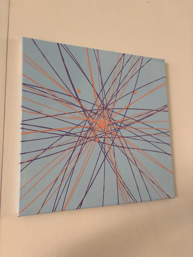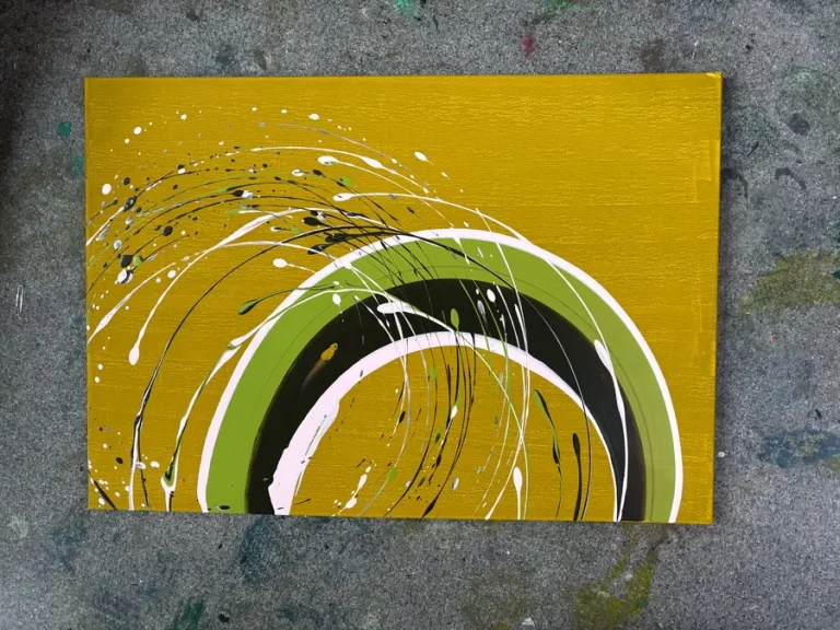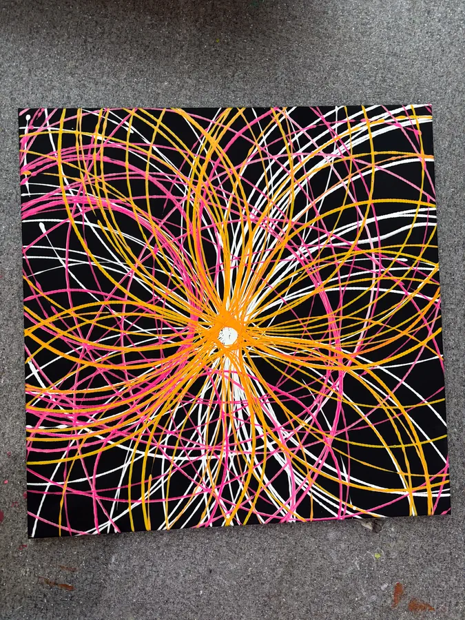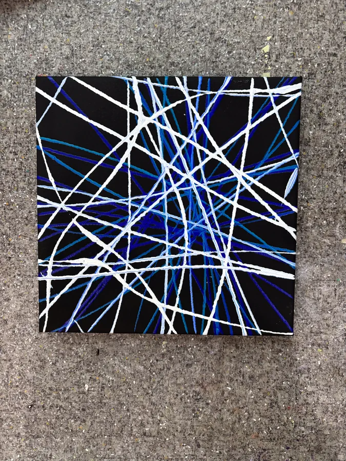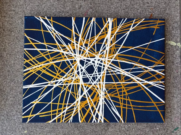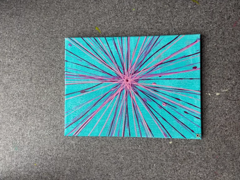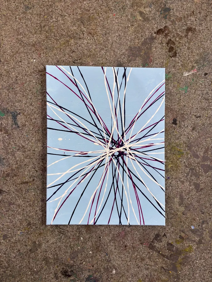 Kyvadlo s barvou se rozhoupe nad plátnem, čímž se tvoří pravidelné linie a geometrické vzory.